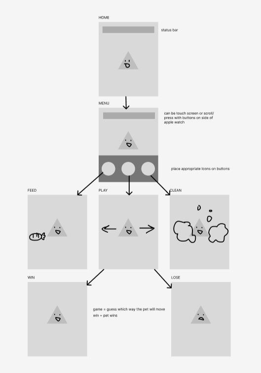 As mentioned, this project arose out of a general passion for video games, the lack of games on the Apple watch app store, and the hope to learn something new about user interface design by designing an application for the smart watch. But video games, as a genre of application, is incredibly broad in on itself—from simple platformers to 3D online shooters, I had to size down and commit myself to something that can function effectively on a small device all the while relying on limited degrees of interaction, and something that had significance to it being on a smart watch. After all, playing something as attention and input demanding as a competitive RTS game would lose value and effectiveness on your wrist compared to a computer. Again, the goal was to make an application that could preserve a similar function and performance despite the cross-platform design. The game I chose had to be simple enough to maintain its identity on a smart watch yet entertaining enough to be played, something that wasn't entirely time-consuming and wouldn't abridge the core purpose of the device it's run on.I struggled to think of how to further approach my questions for a while when suddenly, on an impromptu Target run, I came across a number of new generation Tamagotchi devices for sale—and I was immediately struck with inspiration. I've always had a love for digital pet games for their simplicity and "put down and pick up later" playstyle in that you could progress through the game even if you checked in periodically for just a few minutes, and I felt that this would be a perfect fit to translate into a smart watch device. Not only that, but Tamagotchi themselves are housed on a small device with a screen that's very alike to the size of an Apple Watch's, and utilize only three buttons as mode of input.Now that I knew what to base my application off of, I needed to start thinking about what it might look like.