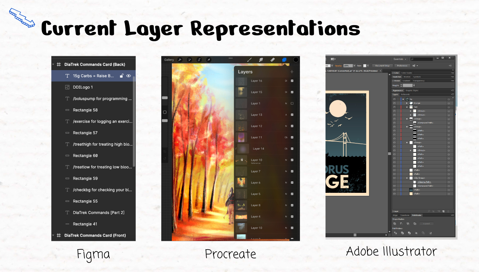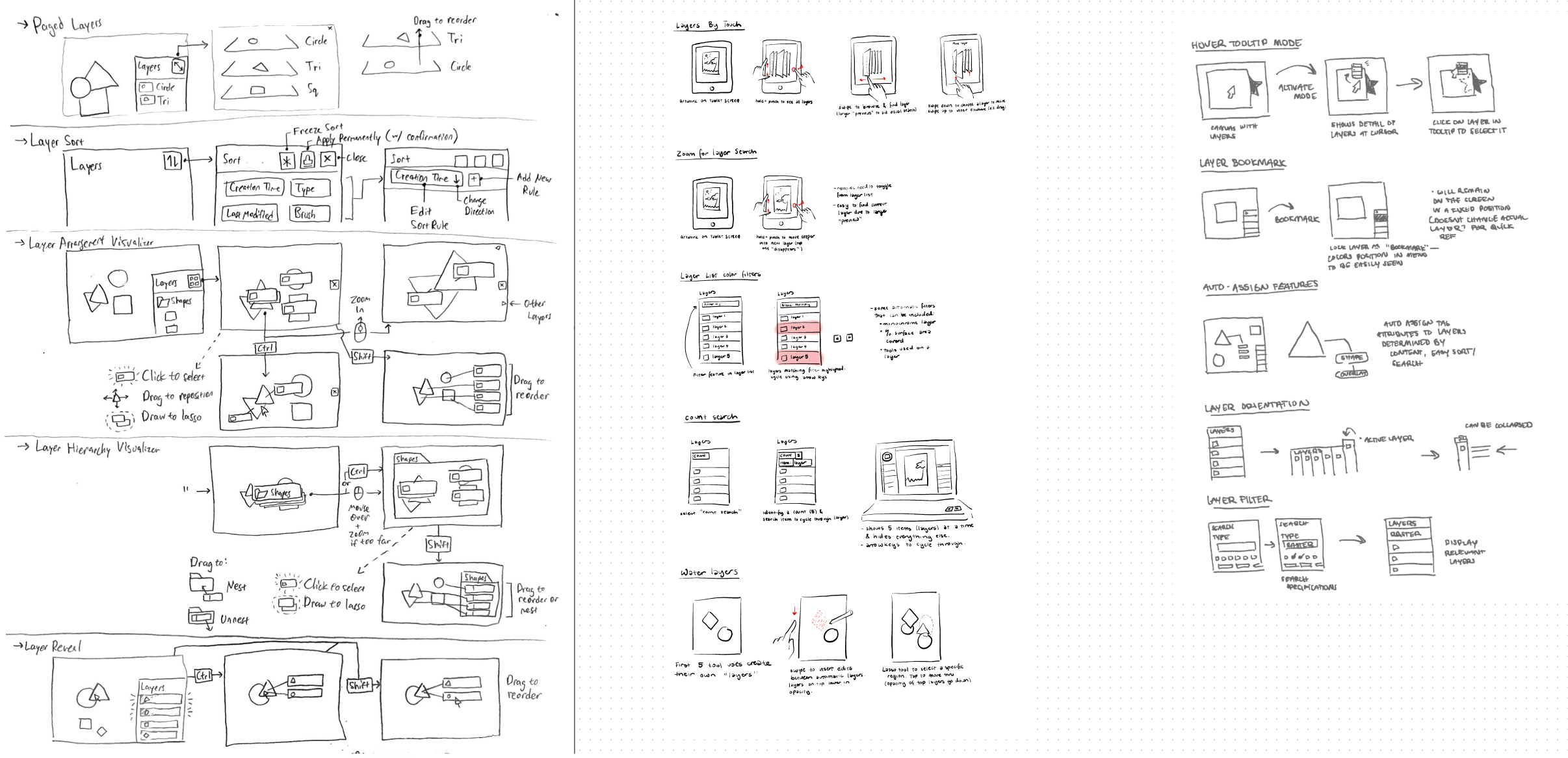 In terms of design applications, "layers" are parts in a composition that can be stacked and manipulated independently. In researching pre-existing representations of layers in such applications, we found that they limit digital artists’ creativity and productivity in their flow of producing artwork, because: